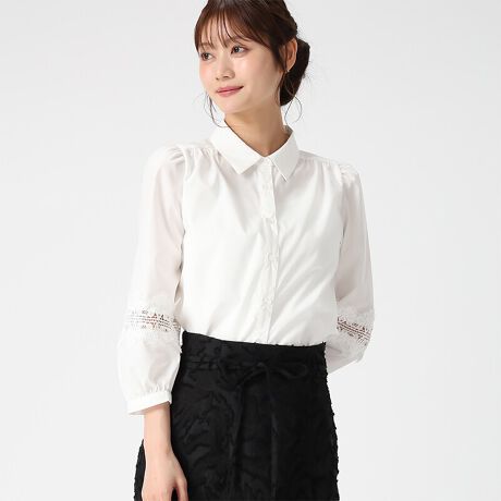 レース切替が上品なアクセントになる、きれいめな印象のシャツブラウス。袖部分にレースを切り替えることで、シンプルな中にさりげない華やかさを添えています。スカートできれいめに、パンツ合わせで大人カジュアルにも着回せます。■fabric透け感[無し]裏地[無し]伸縮性[無し]生地の厚さ[薄手]
