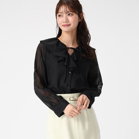 フラワー刺しゅうとフリルカラーが目を引く、華やかさのあるブラウス。透け感のある生地に施した繊細な刺しゅうと、首元のフリルが顔まわりをやさしく演出します。季節の変わり目のお出かけスタイルに大活躍してくれるアイテムです。■fabric透け感[有り]裏地[無し]伸縮性[無し]生地の厚さ[薄手]