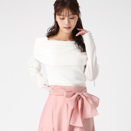 シアー素材のケープデザインが印象的な、女性らしさを引き立てるニットトップス。肩まわりに施したシャーリングとリボンが、さりげないアクセントになっています。スカートでフェミニンにまとめたり、パンツ合わせで甘さを抑えた着こなしも楽しめます。■fabric透け感[やや有り]裏地[無し]伸縮性[有り]生地の厚さ[普通]