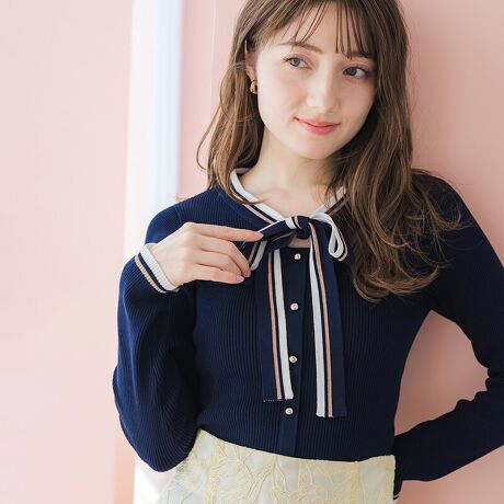 マルチ配色のボウタイが映える、クラシカルな雰囲気のリブニット。