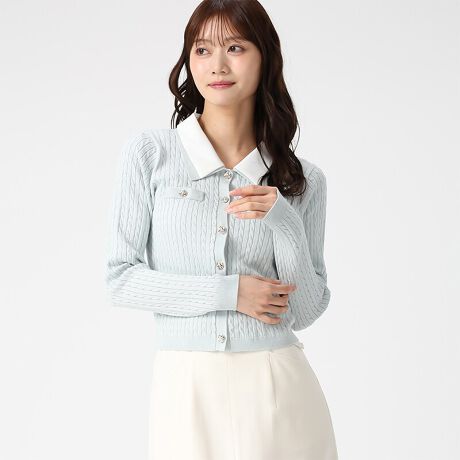 ダブル衿デザインが目を引く、上品さと可愛らしさを併せ持ったケーブルカーディガン。