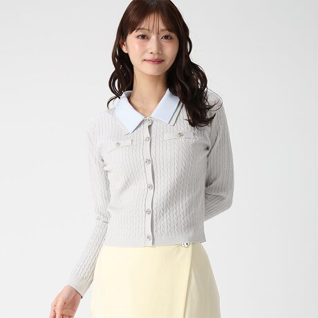 ダブル衿デザインが目を引く、上品さと可愛らしさを併せ持ったケーブルカーディガン。