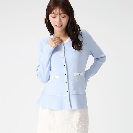 ハリ感のある総針編みとダブルペプラムが印象的なカーディガン。