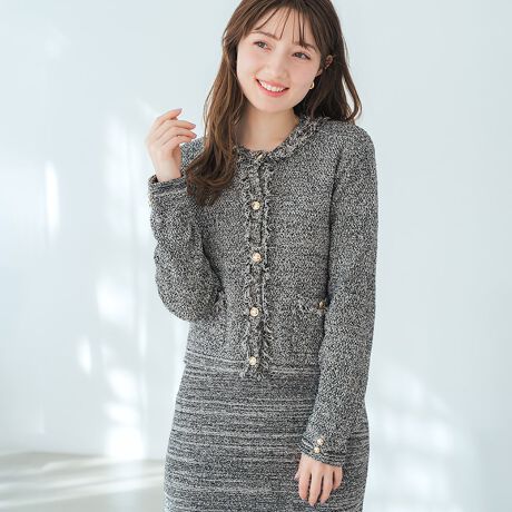 ツイード調の編み地にフリンジディテールを効かせ、上品さと華やかさを兼ね備えたジャケット。