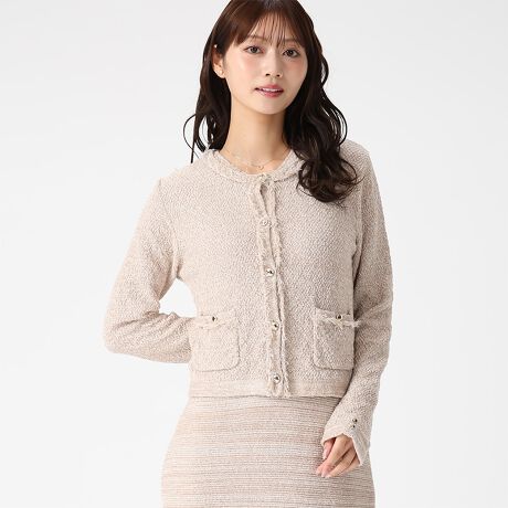 ツイード調の編み地にフリンジディテールを効かせ、上品さと華やかさを兼ね備えたジャケット。