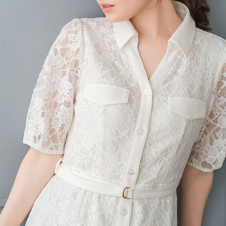 繊細なレース素材に、開襟デザインで程よい抜け感を添えた上品なワンピース。