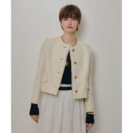 軽やかな春ツィード素材を使用した、上品で洗練された印象のショート丈ジャケット。