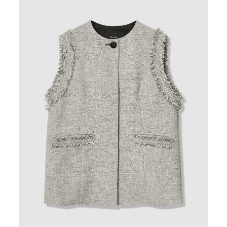襟ぐりのボタンを外して、タキシードカラー風な着こなしも楽しめます。