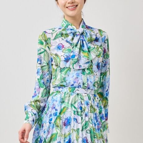 線描きの柔らかな色使いのオリジナルフラワープリントがエレガントな女性らしさを演出するブラウス。首元にはボウタイを施しており、アレンジ次第で様々な表情の変化を楽しめます。ボタンが隠れるフライフロント仕様ですっきりとした印象を演出。さらりとした軽やかな素材感も魅力的です。同シリーズのスカートと合わせればワンピース見えのスタイリングも楽しめます。