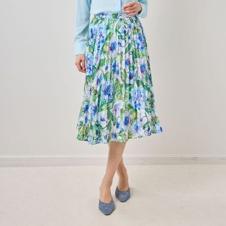 [型番:30-61-08-903]線描きの柔らかな色使いのオリジナルフラワープリントで仕立てられたプリーツスカート。ウエストから裾にかけてプリーツの幅が徐々に広がることで、腰回りをスッキリ見せる視覚効果をもたらします。背面はゴム仕様になっており、お腹を締め付けずラクに着用できるのも魅力。同デザインのブラウスと合わせることで、ワンピース見えのスタイリングも楽しめます。・カラー展開はピンク、ブルー・サイズ展開は1(M)9号・3(2L)13号