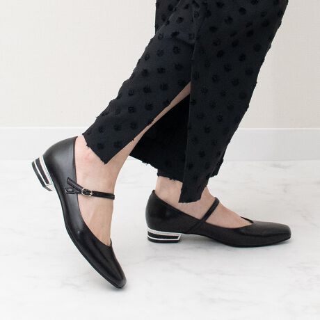 甲ストラップ仕様でホールド感があり、安定感のあるローヒールで疲れにくい快適設計です。
