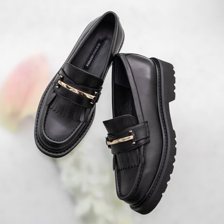レザー素材にメタルバーが映えるフリンジローファー。