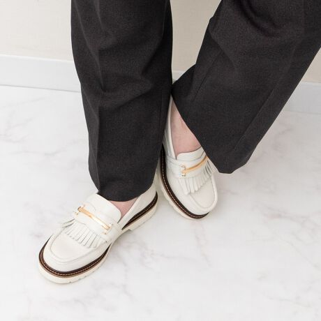 レザー素材にメタルバーが映えるフリンジローファー。