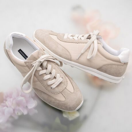 スッキリとしたデザインでクリーンな印象のロープロファイルスニーカーは、同色合わせの素材感が大人っぽい雰囲気です。