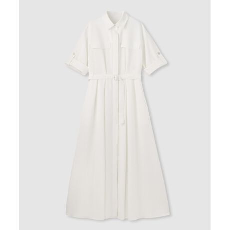 細やかな凸凹感とストレッチがあるサッカー素材。皺になりにくく、ご自宅で手洗い可能なイージーケアも嬉しいポイントです。 抜け感のあるシャツ見頃から裾に向かってウエストタックを贅沢に取り、女性らしいドラマチックなシルエットに。取り外しできるウエストベルトでポイントが付けられるのでスタイルアップも叶う一枚です。袖はターンバック仕様になっているので、暑い時期は勿論、伸ばすと8分丈になるので長い期間楽しめる一枚となっております。一枚で通勤にもデイリーにもお使いいただける万能ワンピです。
