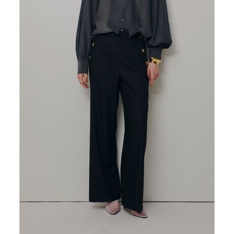 しなやかさと上品な光沢感を併せ持つテンセル混もデニムライクな素材で仕立てたallureville定番のマリンPT。スッキリとした腰回りと美しいストレートラインが特徴の美シルエットPTです。シンプルで合わせる物を選ばないので、カジュアルからキレイ目まで幅広いコーディネートで大活躍してくれる一枚に。ポケットのゴールド釦を、今期はクールな印象の刻みの入った種類でポイントを付けています。
