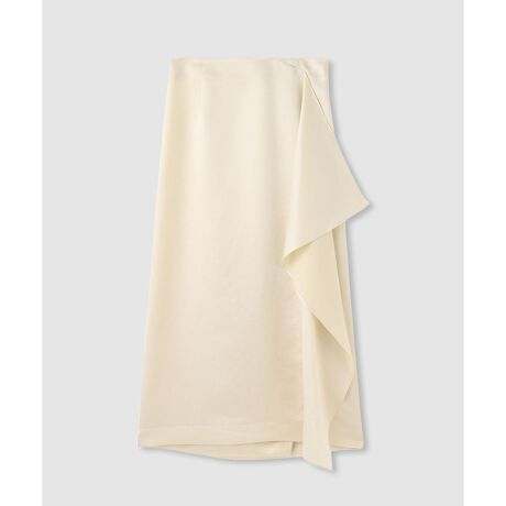 大胆に流れるラッフルが華やかで繊細な雰囲気に仕上げています。バックもラップのようなディテールを入れているので歩いた時の動きのあるデザインに仕上げています。程よくハイウエストです。表からは分かりにくいようにバックのウエストの裏側にゴムを入れ、着やすさもプラスしています。