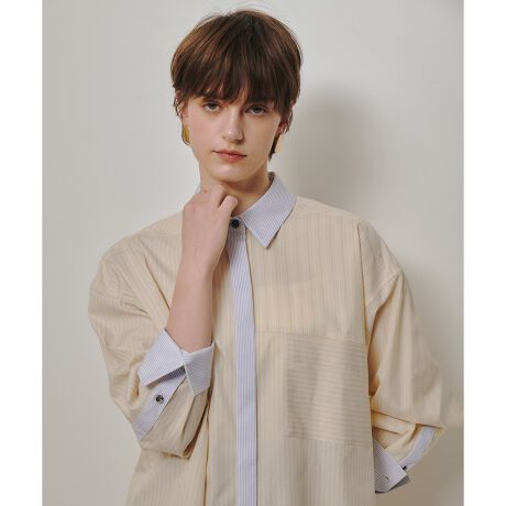 コットンのシャツ地を3タイプ組み合わせたシャツになります。オーバーサイズのドロップショルダーになり、ドルマンスリーブ要素のパターンにしているのでマニッシュな雰囲気の中に女性らしさのある雰囲気に仕上げています。胸のパッチポケットがアクセントになっています。こちらのシャツはデニムやチノ素材のボトムに合わせて着ていただくのがおすすめです。