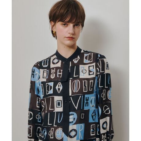 ベルトやバックルのモチーフをアルファベットと合わせて手描き風のモチーフにして更にカラーブロックでアレンジした柄で作成したブラウス。配色のボータイが柄を引き締めるアクセントになっています。シルエットはエレガントな要素がありながらもゆとりあるサイズ感でモダンに仕上げています。アルファベットはさりげなくALLUREVILLEの文字が引用されている遊び心のある柄です。