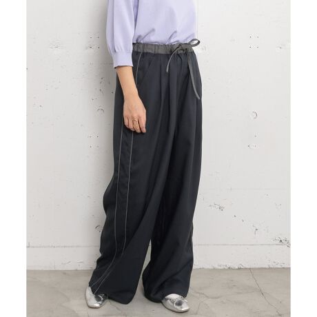 配色ベルトとサイドの2本ラインがポイントのイージーパンツ。縦ラインが強調され、すっきり見えするのも嬉しいポイントです。上品にもカジュアルにも合わせやすい、ドライタッチな素材を使用。フロントタックによる程よいボリューム感が、こなれたシルエットを演出します。ウエストはぐるりゴム仕様で、紐によるサイズ調節が可能。両サイドポケット付き。