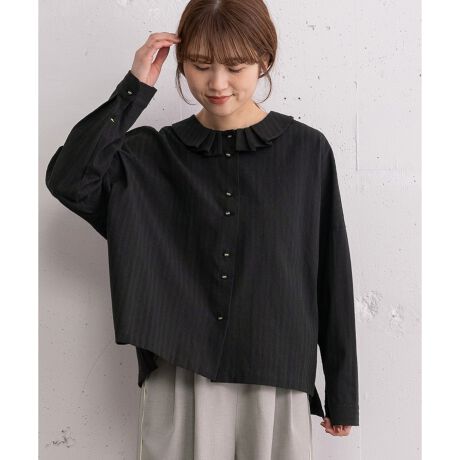 肩を落としたボックスシルエットをベースに、程よい甘さのプリーツ衿をあしらったシャツ。前後差のある着丈とサイドスリットで、こなれた印象に仕上げています。