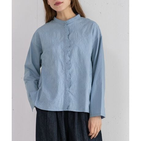 繊細な花柄レースが華やかで、存在感のあるブラウス。衿元はスタンドカラーにすることで、甘さを引き締めたクラシカルな雰囲気に仕上げています。前開きで、羽織としても着用可能。前端のスカラップレース使いがさりげないアクセント。袖口はすとんとしたストレートシルエットなので、まくってカジュアルに着ていただくのもおすすめです。