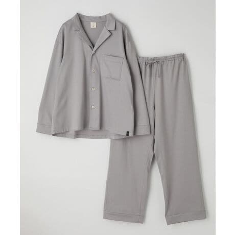 トップスは一般的なパジャマの特徴である「襟の丸み」をシャープにアップデートすることで、外着のシャツのようなビジュアルに。たったひとつのデザインで、印象をガラリと変えています。