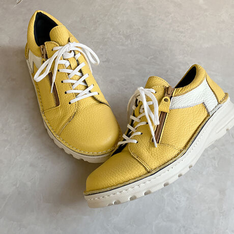 見た目は紐靴ながら、サイドに着脱用ファスナーを備えているため、ひもを結んだままでもスムーズに脱ぎ履きが可能です。