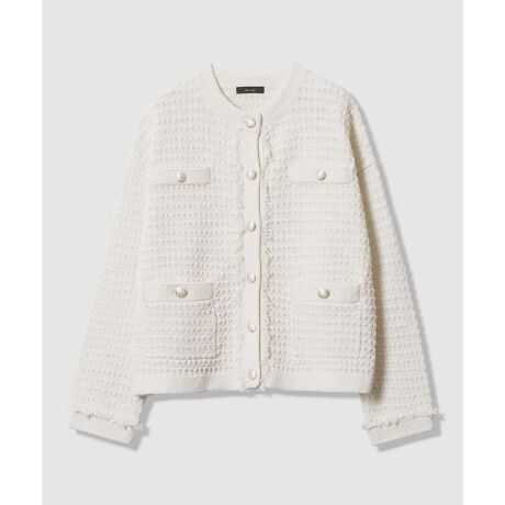 表情のあるコットンの意匠糸に短めのフリンジをあしらったツイードニットジャケットです。