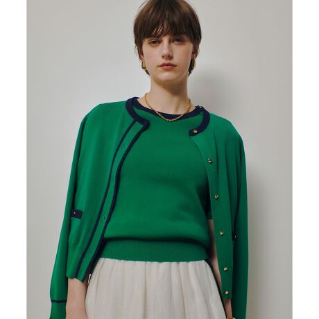 カーディガンには、柔らかく上品なc/#53ラベンダー(ゾッキカラー)や、c/#71グリーン(ネイビーライン配色)、さらにトレンドが再燃しているc/#98ボーダーも新色として仲間入り。