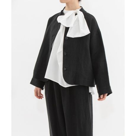 高めのボトルネックの前後どちらでも着られるジャケット。リネンサージとリネンデニム風シャンブレーの展開で、しっかり厚みがありながらソフトな風合いの生地を使用しています。クラシカルな短めの9分袖、両サイドポケットつき。