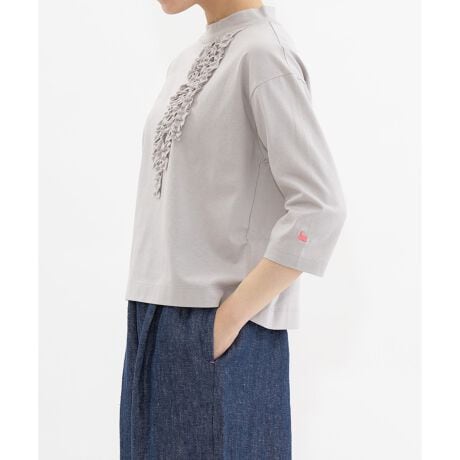 国産生地を使った6分袖のフリルTシャツ。シルエットは程よくゆとりがありながらも、細めの袖ですっきりと上品に着られます。左袖にピンクの小さなスワン刺繍が入ってさりげないポイントになっています。