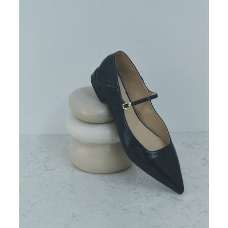 上品なツヤ感のあるフェイクレザーを使用し、ポインテッドトゥとスクエアのカットラインが足元を美しく魅せてくれます。