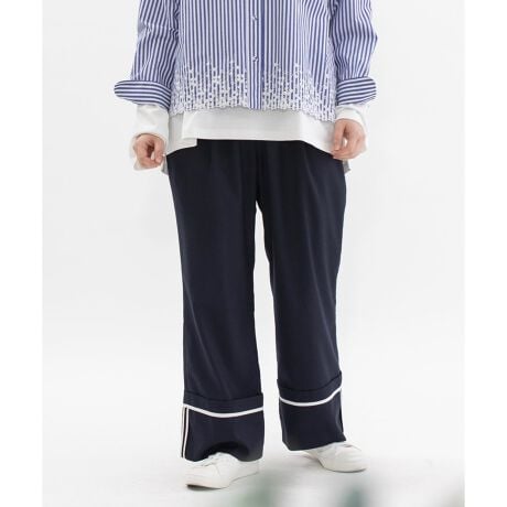 裾をロールアップしたトレンドのデザインパンツ。程よくくびれたワイドストレートがきれいなシルエットのパンツです。ロールアップの縫い代パイピングがアクセントに。シワになりにくいポリエステルレーヨン素材で気軽に着られるのがうれしい。両サイドのポケット口にはスカラップステッチがあり、さりげないアクセントに。ウエストはゴム仕様で、内紐つき。