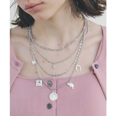 異なるチェーンを重ねたデザインが、首元に奥行きを生み出す4連ネックレス。