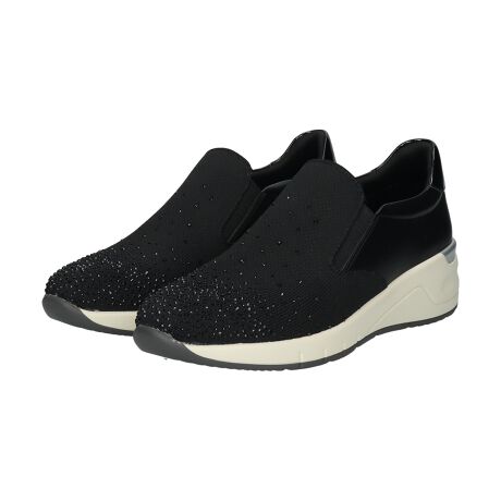 日常に上品なきらめきを添えてくれるスリッポンスニーカー。アッパーにラインストーンをあしらい、華美になりすぎず落ち着いた華やかさを演出します。本底はさりげないヒールアップ設計で自然な脚長効果が期待できるのも嬉しいポイント。スリッポン仕様のため脱ぎ履きしやすく、忙しい毎日でもストレスなくお使いいただけます。クッション性のよいカップインソールが足への負担を軽減し、歩行を快適にサポート。アッパーと中底を袋状に縫い合わせる袋縫い製法を採用、足を優しく包み込み、足の動きにしなやかに寄り添う屈曲性が魅力の普段使いからお出かけまで幅広く活躍する1足です。