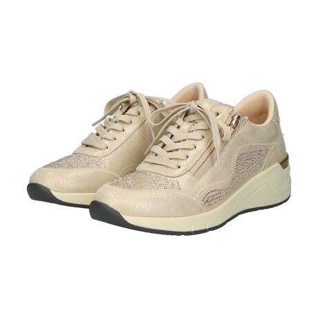 上品な輝きと実用性を両立した大人の女性にぴったりのスニーカー。アッパーにはラインストーンをあしらい、光を受けてさりげなくきらめくデザインが、普段の装いを華やかに引き立てます。サイドジップ仕様により、靴ひもを結び直すことなく脱ぎ履きがスムーズにでき、忙しい毎日でもストレスを感じにくいのが魅力。本底はさりげないヒールアップ設計で自然な脚長効果が期待できるのも嬉しいポイント。クッション性のよいカップインソールが足への負担を軽減し、歩行を快適にサポート。アッパーと中底を袋状に縫い合わせる袋縫い製法を採用、足を優しく包み込み、足の動きにしなやかに寄り添う屈曲性が魅力の普段使いからエレガントなスタイルまで幅広く活躍する1足です