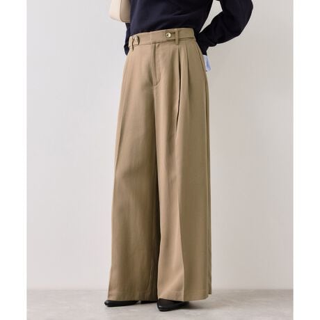 ・ウエストのメタル釦がポイントに。ベルトなしでも決まるワイドパンツです
