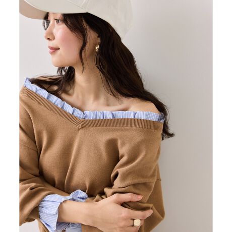 ネックと袖にシャツ素材でフリルをドッキングした華やかな印象のニットトップス。