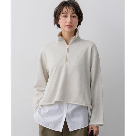 ハーフジップが今季らしいトレンド感を演出するプルオーバーです。襟元を開けてインナーを見せるレイヤードスタイルがおすすめで、シャツやタートルネックを覗かせると、よりこなれた印象に仕上がります。袖口と裾は断ち切り風のラフな仕様にすることで、抜け感をプラスしました。ゆったりとしたシルエットながらも、上品な素材感でカジュアルになりすぎず、大人の女性にぴったりの一枚です。 カラーは、クリーンで上品な印象のアイボリー(#002)と、シックで着回し力の高いネイビー(#075)の2色展開です。