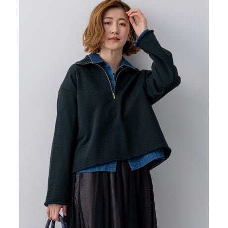ハーフジップが今季らしいトレンド感を演出するプルオーバーです。襟元を開けてインナーを見せるレイヤードスタイルがおすすめで、シャツやタートルネックを覗かせると、よりこなれた印象に仕上がります。袖口と裾は断ち切り風のラフな仕様にすることで、抜け感をプラスしました。ゆったりとしたシルエットながらも、上品な素材感でカジュアルになりすぎず、大人の女性にぴったりの一枚です。 カラーは、クリーンで上品な印象のアイボリー(#002)と、シックで着回し力の高いネイビー(#075)の2色展開です。