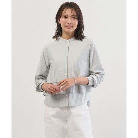 フロントのフリルがポイントのストライプ柄のカットソー。カジュアルな日常使いはもちろん、少しフォーマルなシーンにも着用できるデザインが魅力です。大きめのフリルデザインは、ストライプ柄にのせることで甘さを抑え、大人の女性にふさわしい上品な華やかさを演出します。前開き仕様となっているため、ボタンを閉じてブラウスとしてはもちろん、軽い羽織りとしても活躍する、着回し力のある1着です。季節を問わず、装いの幅を広げてくれるアイテムです。カラーは、爽やかで清潔感のあるホワイトベース(#101)、明るく軽快な印象のミントベース(#162)、きちんと感のあるネイビーベース(#175)の3色展開です。