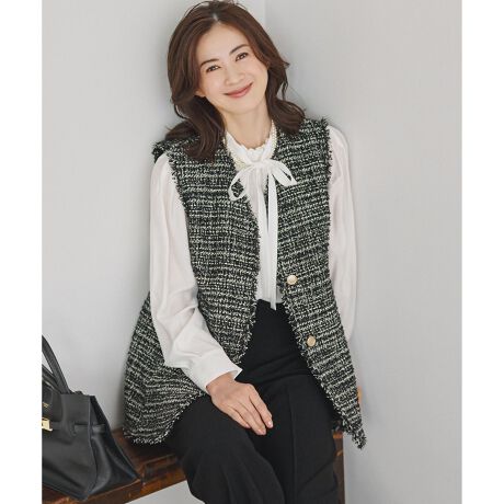 縦ラインとウエストの切り替えが品良くボディーラインに沿う、程よいカーヴィーシルエットのジレ。インナーにニットを合わせた普段使いはもちろん、セレモニーやお呼ばれなどのオケージョンシーンにもおすすめです。前ボタンを留めるとシルエットが綺麗に着用出来ます。ボタンを外して、ボトムはデニムをチョイスしたラフな着こなしも◎。カラーは、柔らかな光を纏うアイボリーミックス(#302)、クラシックで深みのあるネイビーミックス(#375)、シックなコントラストのモノトーンミックス(#305)と、オケージョンシーンにも合わせやすい3色展開です。
