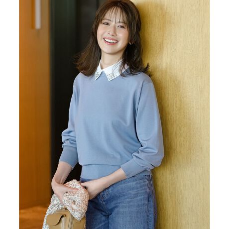 まるでブラウスを重ね着しているかのような、布帛の襟がドッキングされたニットプルオーバーです。襟の先端には繊細なビジューがあしらわれ、顔周りを華やかに彩ります。襟は取り外しが可能で、シンプルなクルーネックニットとしてもお楽しみいただける2WAY仕様です。身頃はストレッチ糸を一緒に編み込んだ天竺編みで、着心地の良さも追求しました。後ろは開閉できる仕様になっており、着脱のしやすさもポイントです。 オフィススタイルにはもちろん、デニムと合わせてカジュアルダウンしたり、きれいめスカートと合わせてお食事会にも。幅広いシーンで上品な着こなしを叶えます。 カラーは、シックなブラック(#005)、爽やかなスカイブルー(#072)、そして知的な印象のネイビー(#075)の3色展開で、ブラックとスカイブルーには清潔感のあるオフの襟を配し、ネイビーには爽やかなサックスの襟を配しました。