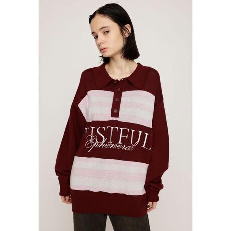 【FRONT LOGO POLO TOPS】■POINT:フロントに大胆にあしらわれたロゴ刺繍と配色ボーダーがトレンドスタイルを完成させるポロデザインニット。程よくゆとりのあるシルエットで身体のラインを拾いにくく体型カバーも叶うアイテムです。1枚でトレンド感のあるスタイルを完成させる主役級トップスです。■DETAIL:カジュアルな印象のロゴニットながら、襟付きデザインで女性らしさをプラス。ボディごとに異なるボーダー配色とロゴ刺繍のカラーにもこだわりました。秋冬らしいトーンに抑えた配色が、ヴィンテージライクな雰囲気を漂わせます。■STYLING:ミニボトムスと合わせてワンピース風に着用するのが今季の一押しスタイルです。キャミソールワンピースを中にレイヤードすると、こなれ感のあるトレンドライクな着こなしが完成します。定番にデニムやスラックスとの相性も抜群です。■FABRIC/MATERIAL:程良い厚みのアクリルコットン素材を使用。■透け感:なし■光沢感:なし■伸縮性:なし■裏 地:なし[注意事項]※画像の商品はサンプルです。実際の商品と仕様、加工が若干異なる場合があります。※画像の商品は光の照射や角度、お使いのモニター環境により、実物と色味が異なる場合がございます。※着用、お取り扱いの際は、アテンションタグをご確認ください。※一部予約商品につきましては生産上の都合によりお届け予定日や店頭発売と前後する場合もございます。※追加生産商品は、一部の店舗、通販で販売中の場合がございます。予めご了承下さい。