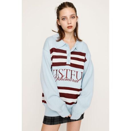 【FRONT LOGO POLO TOPS】■POINT:フロントに大胆にあしらわれたロゴ刺繍と配色ボーダーがトレンドスタイルを完成させるポロデザインニット。程よくゆとりのあるシルエットで身体のラインを拾いにくく体型カバーも叶うアイテムです。1枚でトレンド感のあるスタイルを完成させる主役級トップスです。■DETAIL:カジュアルな印象のロゴニットながら、襟付きデザインで女性らしさをプラス。ボディごとに異なるボーダー配色とロゴ刺繍のカラーにもこだわりました。秋冬らしいトーンに抑えた配色が、ヴィンテージライクな雰囲気を漂わせます。■STYLING:ミニボトムスと合わせてワンピース風に着用するのが今季の一押しスタイルです。キャミソールワンピースを中にレイヤードすると、こなれ感のあるトレンドライクな着こなしが完成します。定番にデニムやスラックスとの相性も抜群です。■FABRIC/MATERIAL:程良い厚みのアクリルコットン素材を使用。■透け感:なし■光沢感:なし■伸縮性:なし■裏 地:なし[注意事項]※画像の商品はサンプルです。実際の商品と仕様、加工が若干異なる場合があります。※画像の商品は光の照射や角度、お使いのモニター環境により、実物と色味が異なる場合がございます。※着用、お取り扱いの際は、アテンションタグをご確認ください。※一部予約商品につきましては生産上の都合によりお届け予定日や店頭発売と前後する場合もございます。※追加生産商品は、一部の店舗、通販で販売中の場合がございます。予めご了承下さい。