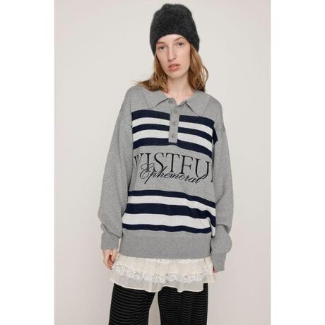 【FRONT LOGO POLO TOPS】■POINT:フロントに大胆にあしらわれたロゴ刺繍と配色ボーダーがトレンドスタイルを完成させるポロデザインニット。程よくゆとりのあるシルエットで身体のラインを拾いにくく体型カバーも叶うアイテムです。1枚でトレンド感のあるスタイルを完成させる主役級トップスです。■DETAIL:カジュアルな印象のロゴニットながら、襟付きデザインで女性らしさをプラス。ボディごとに異なるボーダー配色とロゴ刺繍のカラーにもこだわりました。秋冬らしいトーンに抑えた配色が、ヴィンテージライクな雰囲気を漂わせます。■STYLING:ミニボトムスと合わせてワンピース風に着用するのが今季の一押しスタイルです。キャミソールワンピースを中にレイヤードすると、こなれ感のあるトレンドライクな着こなしが完成します。定番にデニムやスラックスとの相性も抜群です。■FABRIC/MATERIAL:程良い厚みのアクリルコットン素材を使用。■透け感:なし■光沢感:なし■伸縮性:なし■裏 地:なし[注意事項]※画像の商品はサンプルです。実際の商品と仕様、加工が若干異なる場合があります。※画像の商品は光の照射や角度、お使いのモニター環境により、実物と色味が異なる場合がございます。※着用、お取り扱いの際は、アテンションタグをご確認ください。※一部予約商品につきましては生産上の都合によりお届け予定日や店頭発売と前後する場合もございます。※追加生産商品は、一部の店舗、通販で販売中の場合がございます。予めご了承下さい。