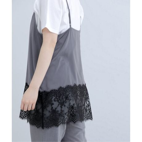 落ち感の美しいサテン生地に、デコルテと裾のレースが華やかさを添え、レイヤードするだけでスタイリングをぐっと女性らしく引き上げてくれます。