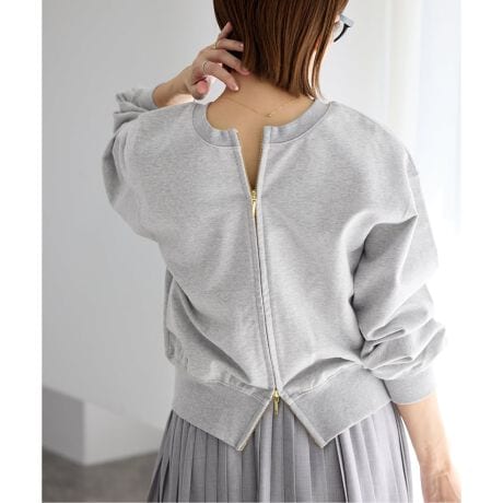 ベーシックなクルーネックスウェットをベースに、逆開きのオープンファスナーを採用。