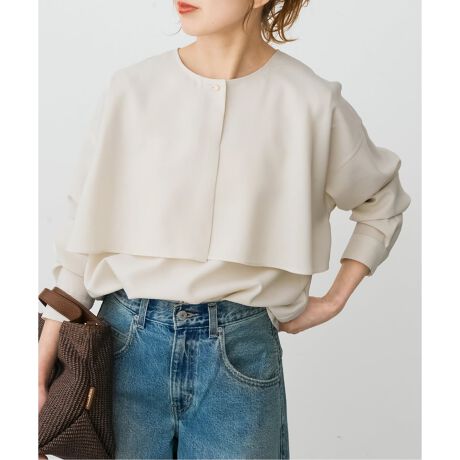ケープ風のヨークデザインが印象的な、きれいめブラウス。程よい光沢感と落ち感のある素材が、上品さの中にさりげない華やかさをプラスし、顔まわりを明るく演出します。シンプルながらも存在感のあるデザインで、一枚で着映えするのも魅力です。